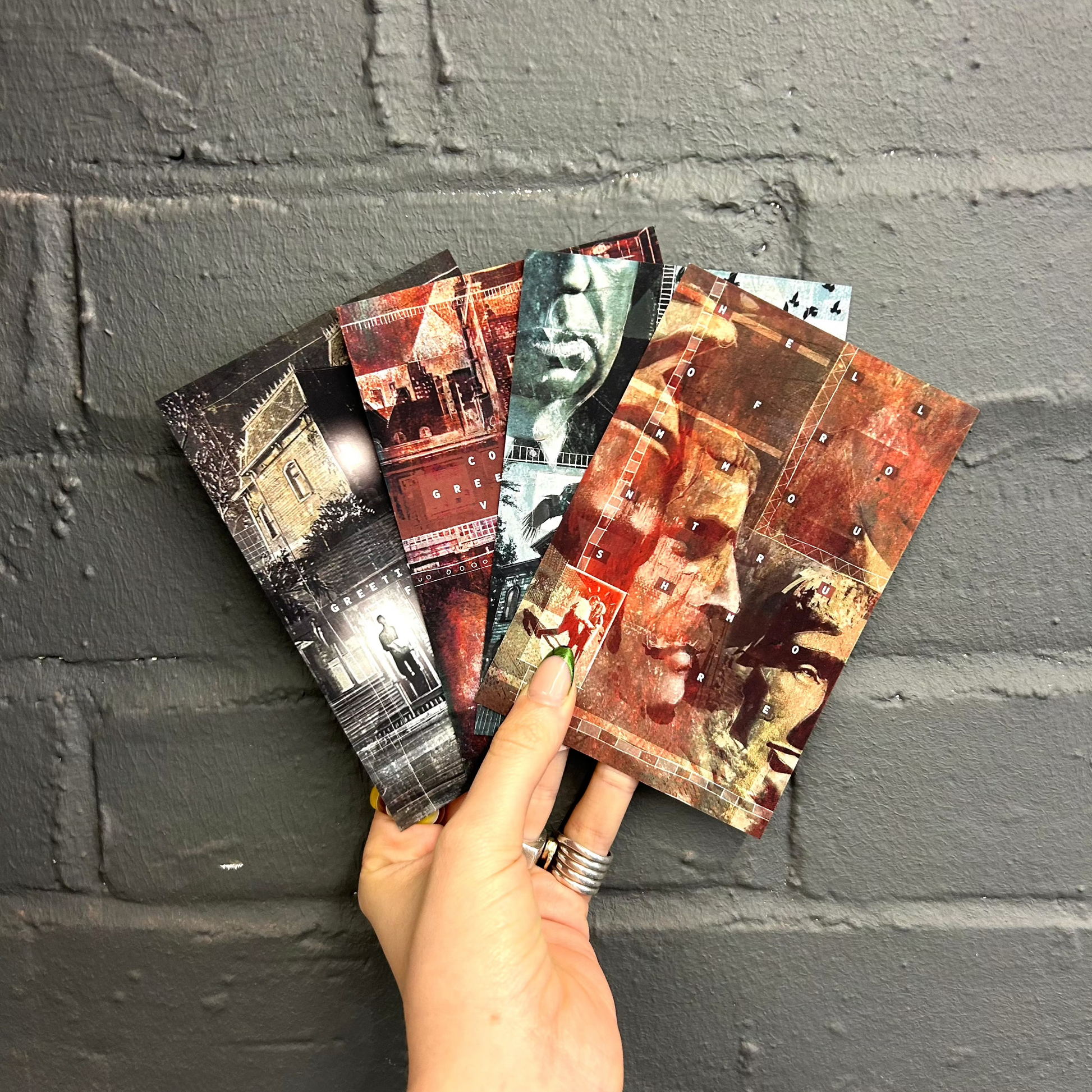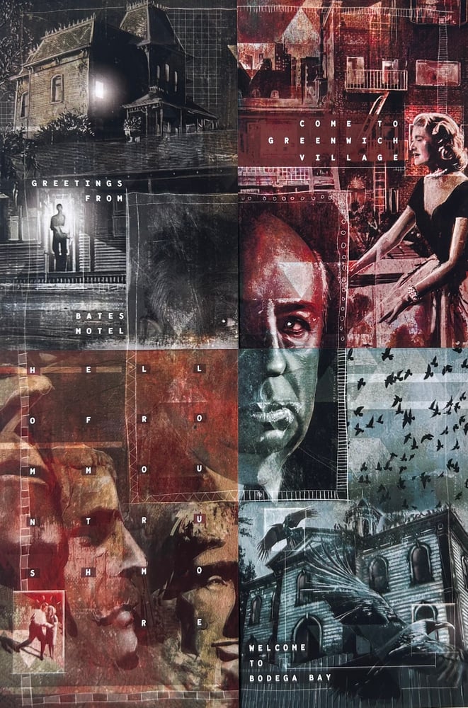 Set of 4 Alfred Hitchcock postcards (Psycho, The Birds, Rear Window, North by Northwest), originally created for Gallery 1988 "Postcard Correspondence" All 4 postcards connect to reveal a portrait of Hitchcock himself.